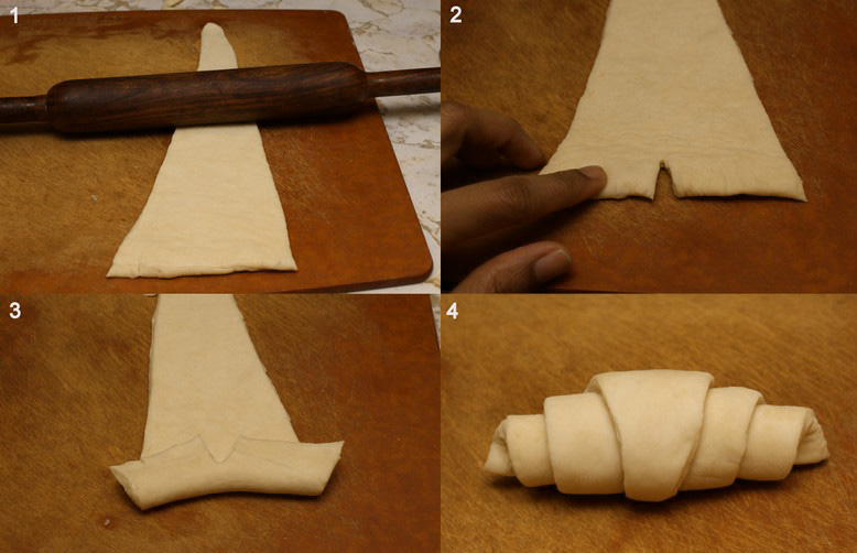 Extienda la masa sobre 4 mm de grosor y luego corte triángulos de 10 a 12 cm de base. Haga una raira en el centro de la base y enrolle según la imagen: