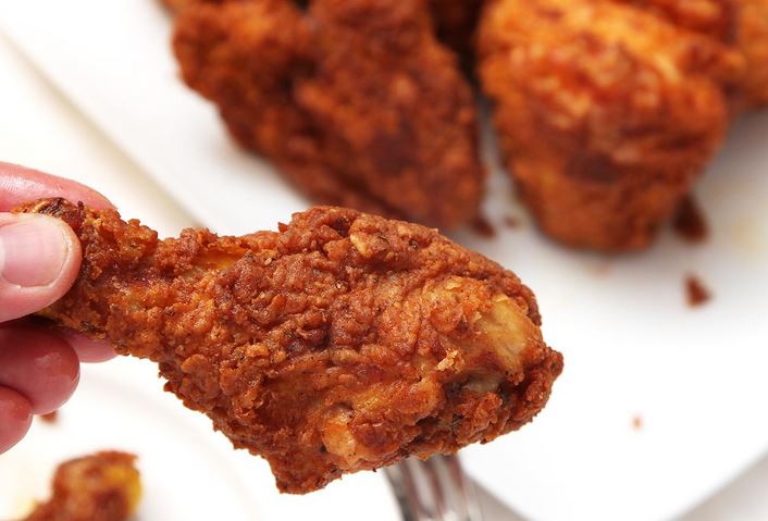 7.Coloque el plato de pollo cocido en el refrigerador durante al menos 1 hora, y hasta la noche. Cuando esté listo para servir, vuelva a calentar el aceite a 400 ° F. Agregue los trozos de pollo y cocine, volteándolos una vez a la mitad de la cocción, hasta que estén completamente crujientes, aproximadamente 5 minutos. Transfiera a una bandeja para hornear con borde para drenar y retirar la grasa, luego sirva inmediatamente.